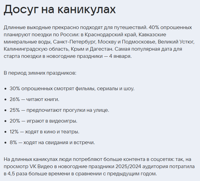 Популярные способы досуга в новогодние каникулы, по данным VK Рекламы