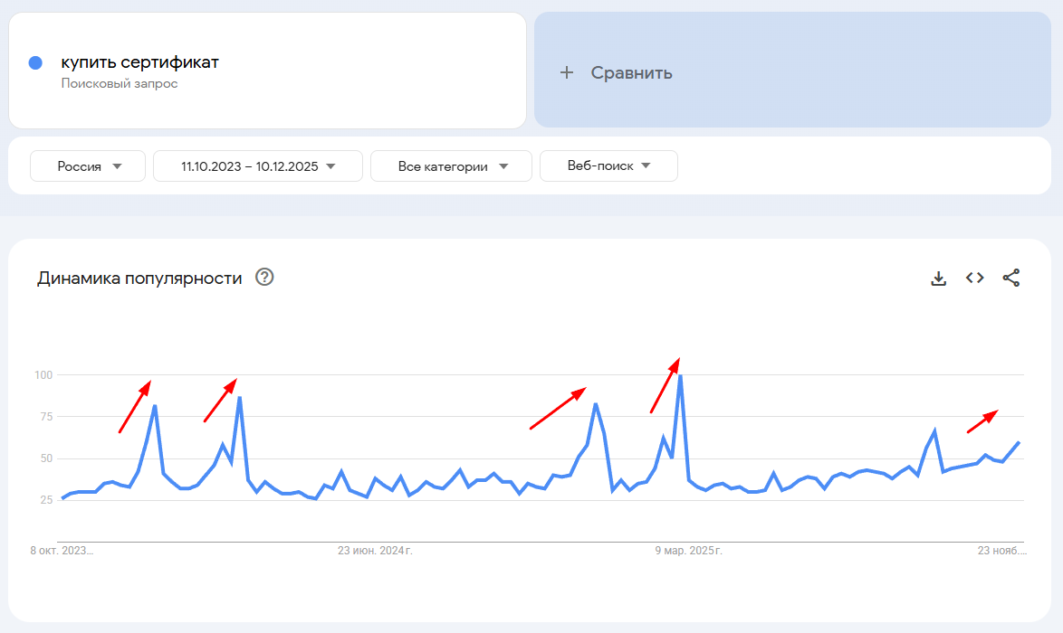 Кроме Яндекс Вордстата проанализировать спрос можно с помощью Google Trends. Здесь доступна история за последние 5 лет. То есть вы можете посмотреть, как меняется популярность товара из года в год.