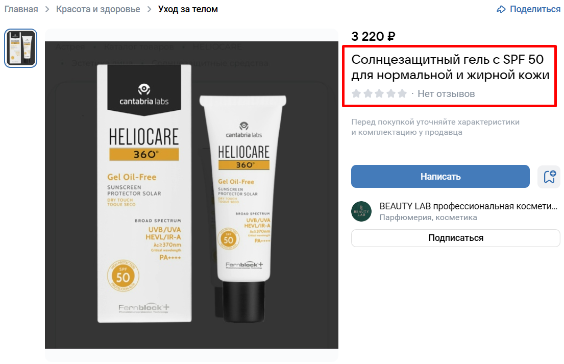 ВК дает использовать названия до 120 символов длиной. Поместите в него ключевые параметры товара — бренд, модель, размер, цвет и т. д. Включите поисковые запросы, по которым товары могут искать покупатели. Чтобы собрать такие запросы, можно пользоваться теми же инструментами, что и при подборе семантики для поисковой оптимизации сайта. Это не только упростит клиентам восприятие, но и позволит товару появляться в поисковой выдаче Маркета по соответствующим запросам.