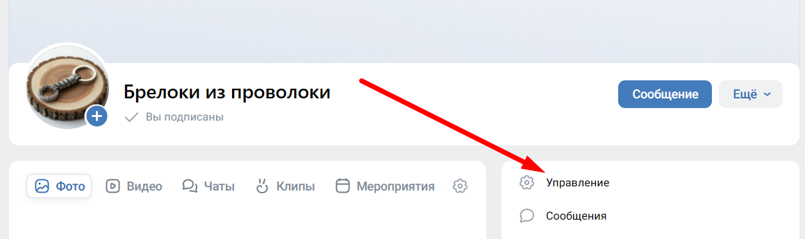 Но прежде чем добавлять карточки товаров в группу, нужно подключить к ней витрину. Это можно сделать через настройки сообщества. На странице группы в правом меню нажимаем на «Управление»: