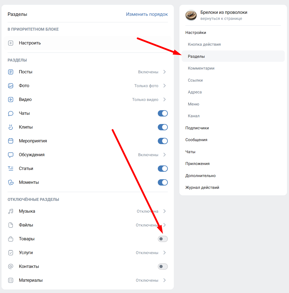 В блоке «Настройки» нажимаем на пункт «Разделы» и проматываем вниз. Там включаем ползунок «Товары»: