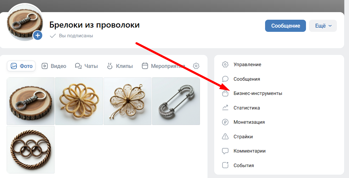 После этого в инструментах управления сообществом должна появиться вкладка «Бизнес-инструменты». Нажмите на нее, чтобы перейти в блок создания товаров.