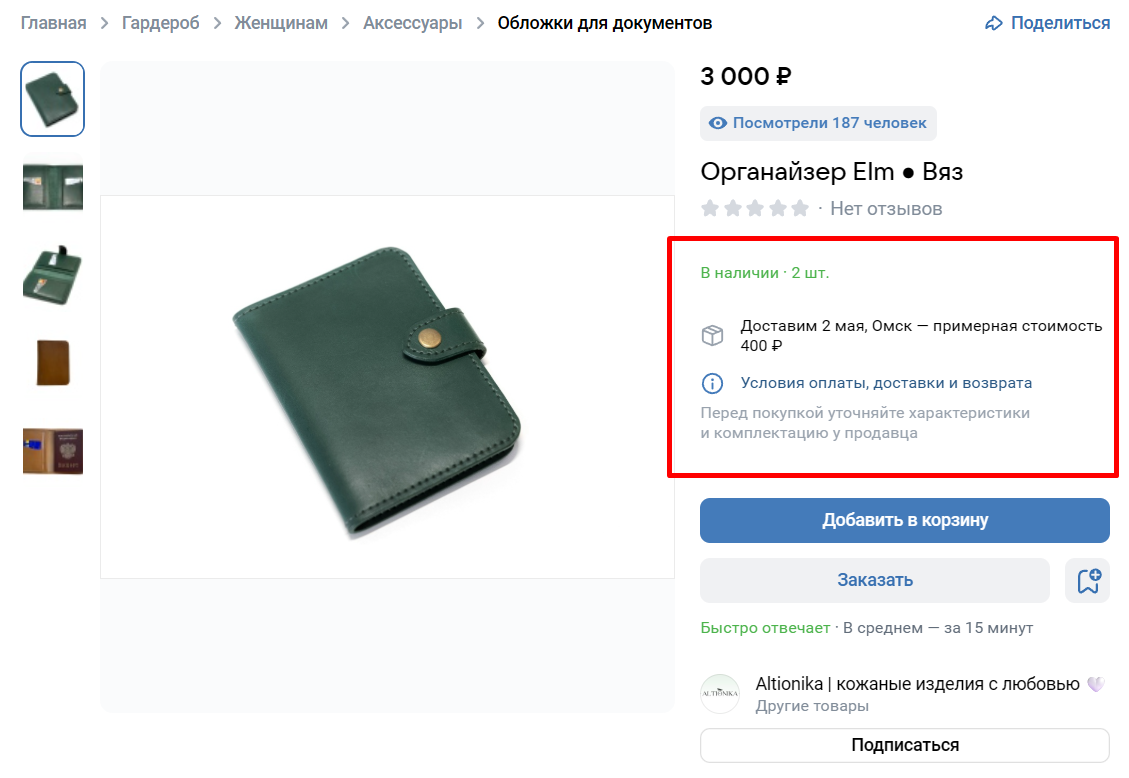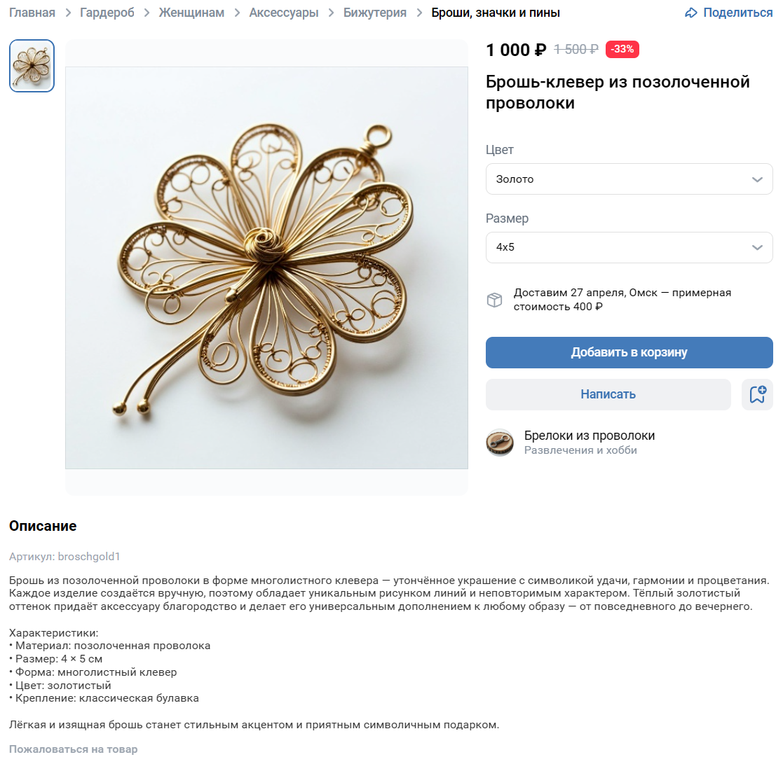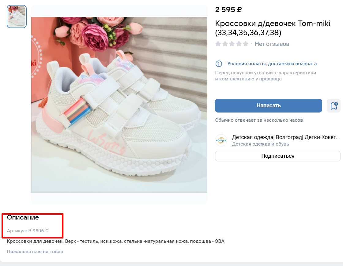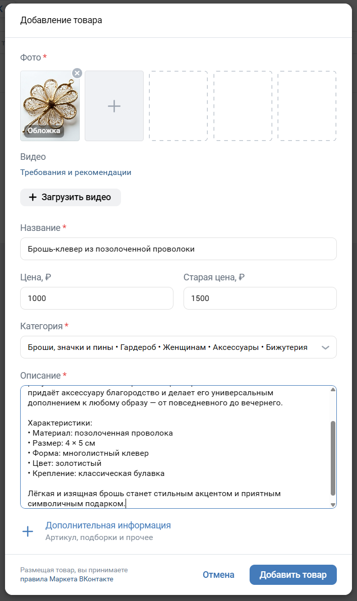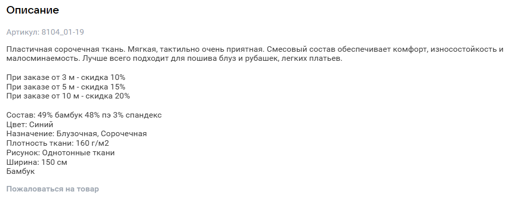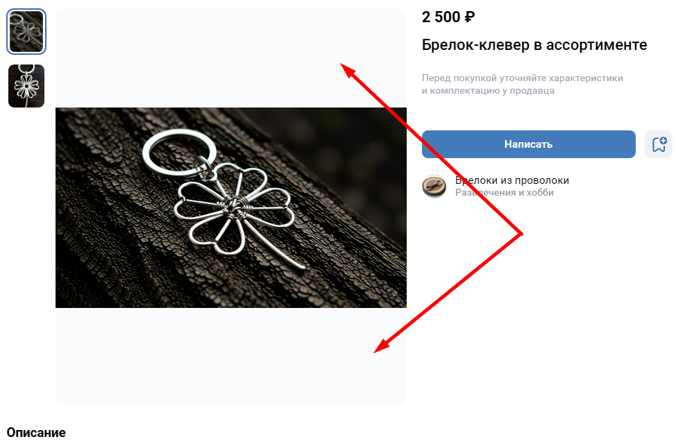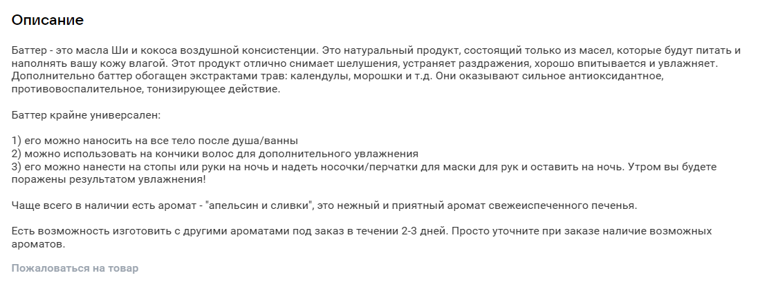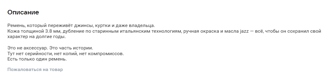 Соцсеть позволяет загружать описание товара объемом до 5000 знаков. Но не нужно обязательно использовать их все: расскажите о товаре главное, что будет полезно и интересно покупателям — его характеристики, преимущества и особенности. В идеале — в формате нескольких кратких абзацев, списка или таблицы, это повысит удобство восприятия.