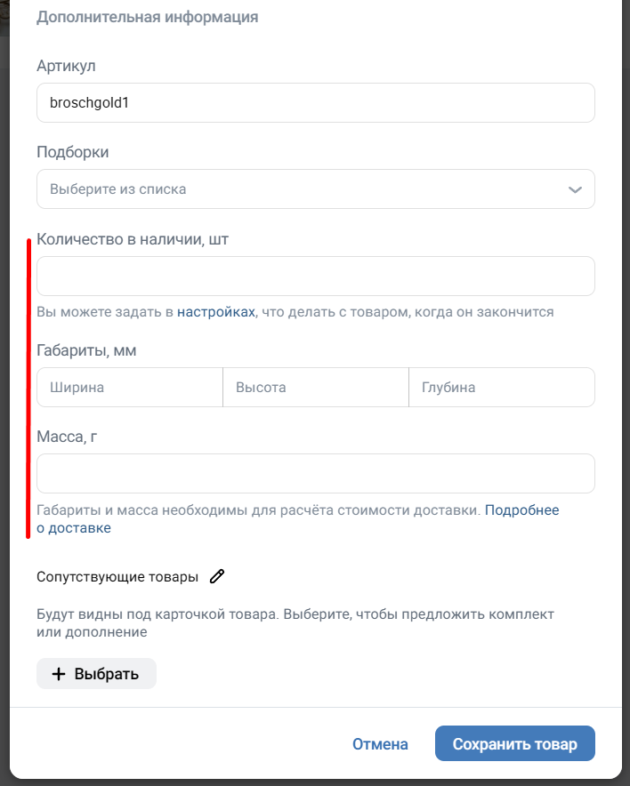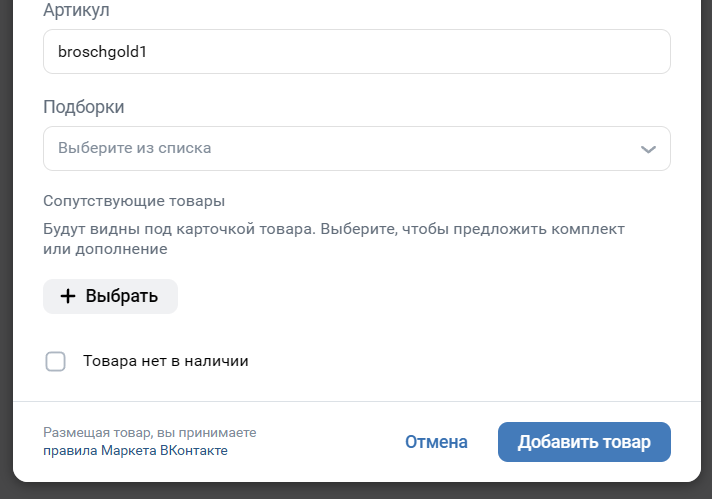 Также можно заполнить дополнительные поля: указать артикул для простоты учета, добавить карточку в подборку, сопроводить его сопутствующими товарами. Если продукции сейчас нет в наличии, можно поставить соответствующую галочку, чтобы убрать карточку из публикации.