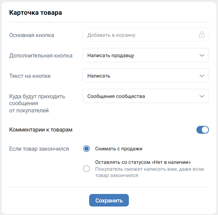 Определяют, как покупатель будет взаимодействовать с карточкой. В «расширенной» версии магазина он может сразу добавить товар во внутреннюю корзину Маркета соцсети или связаться с владельцем, чтобы что-то уточнить. В «базовом» магазине доступны другие варианты кнопок — «написать» или «позвонить» для связи с продавцом через сообщения или по указанному телефону, а также кнопка-ссылка на карточку в стороннем магазине.