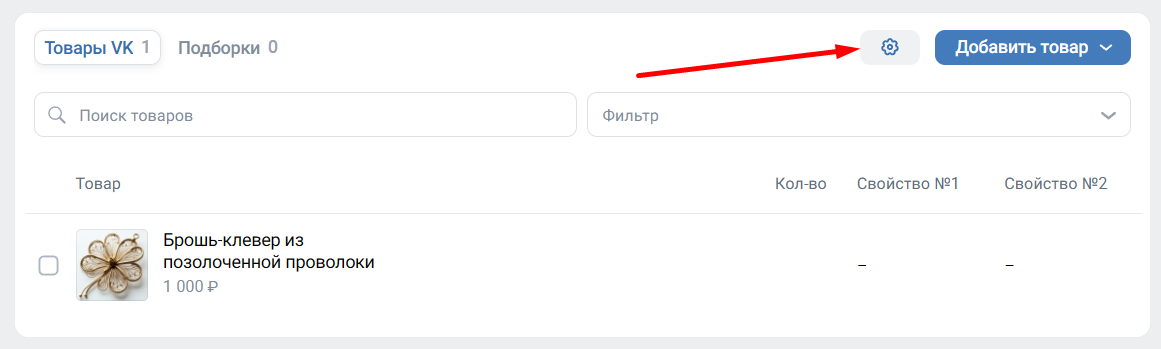Для начала нужно создать само свойство. Для этого нажмите на шестеренку справа от кнопки «Добавить товар».