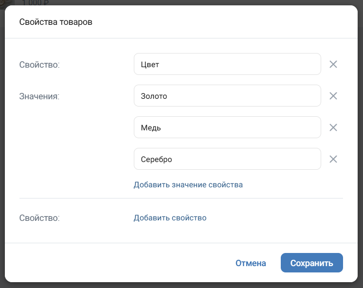 Ещё в расширенном режиме появится возможность задать товарам свойства. Это добавит в карточки выбор варианта (например, цвет, размер, комплектация), если вы предлагаете похожие товары с некоторыми вариациями.