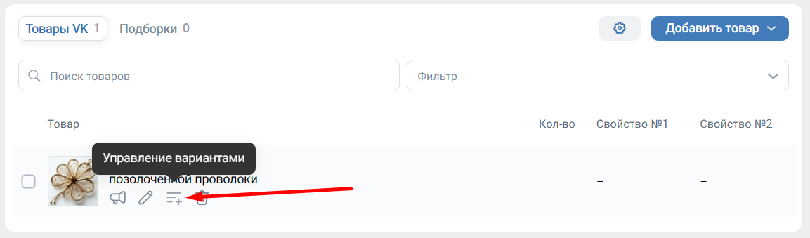 У товара может быть только два свойства. Чтобы добавить их, в основном разделе нажмите на кнопку «Управление вариантами» под нужной карточкой. Она появляется, если навести курсор на товар: