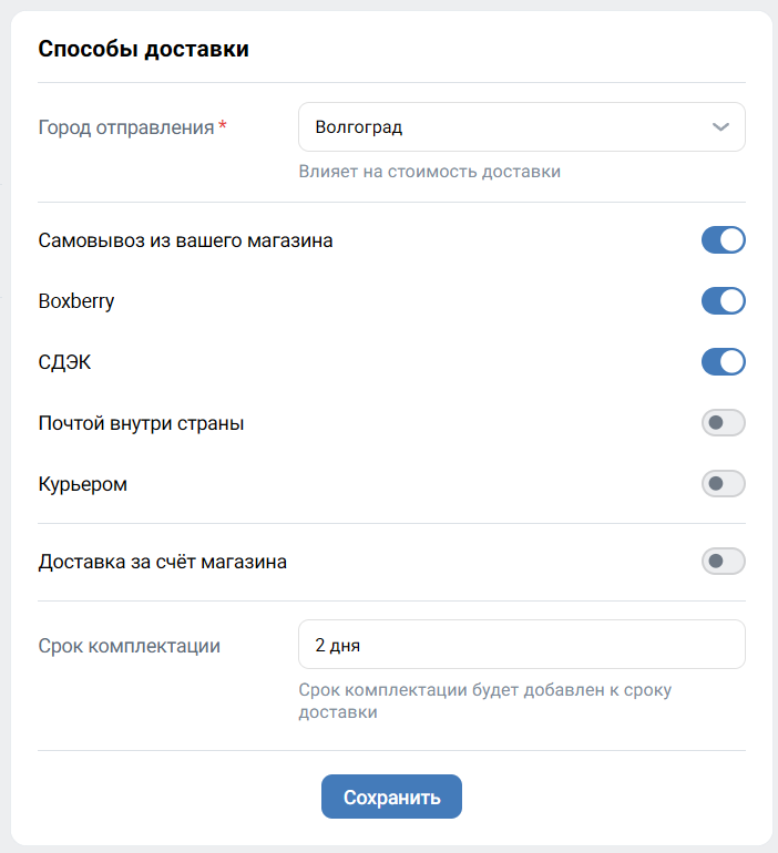 Наконец, настройте способы доставки. Укажите, откуда вы будете отправлять товар, отметьте подходящие вам почтовые или курьерские службы, пропишите срок комплектации для более точного расчета времени доставки. Вы также можете взять стоимость доставки на себя — это повысит лояльность покупателей.
