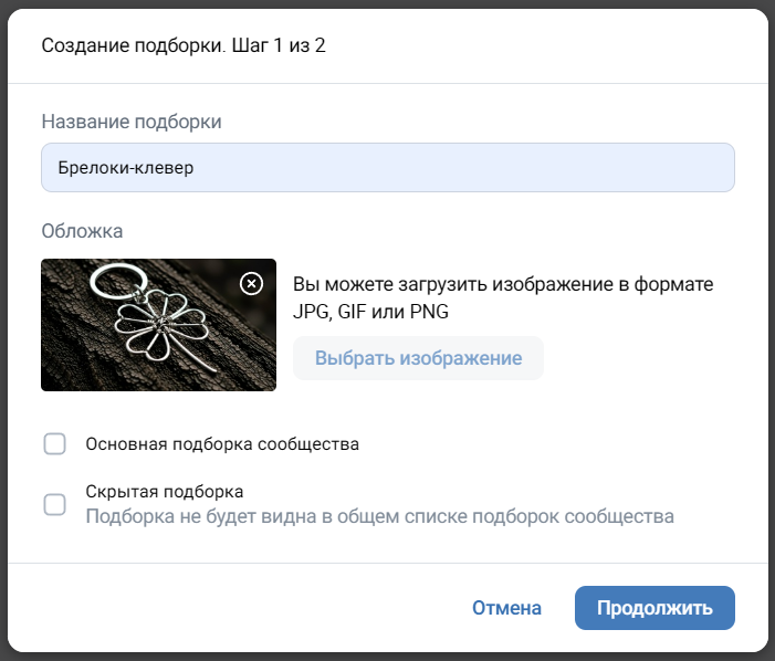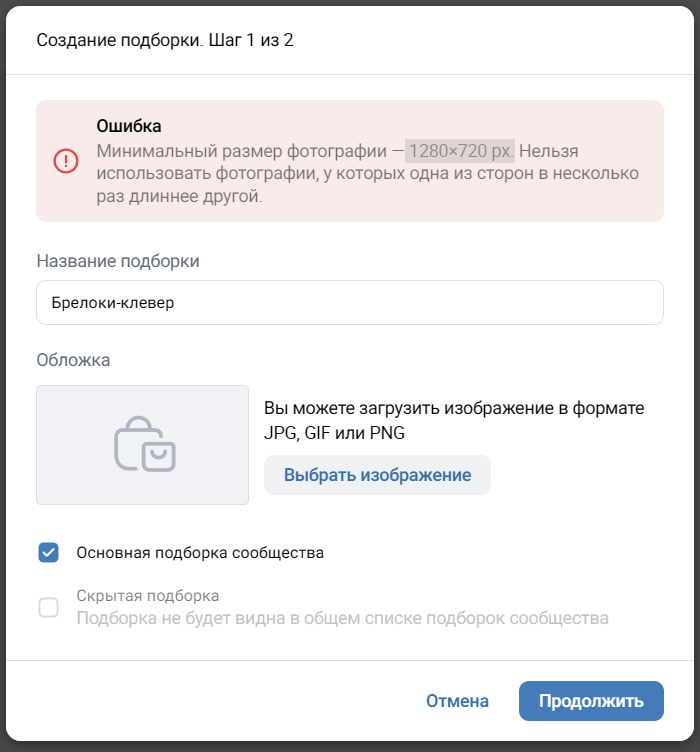 Отдельные требования есть к обложкам подборок товаров. Они должны иметь соотношение сторон 16:9 и иметь ширину не меньше 1280 пикселей, а высоту — не меньше 720 пикселей. Иначе ВКонтакте просто не даст загрузить картинку.
