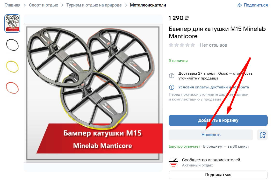 Появится кнопка, по которой можно связаться с продавцом. Если вы выбрали расширенный режим работы витрины, вместо нее будет кнопка «Добавить в корзину», связь с продавцом останется как дополнительная опция.