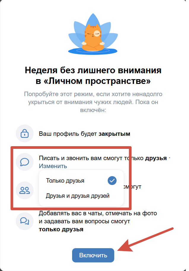 3. Система оповестит, что аккаунт закроется для посторонних на одну неделю, доступ будет только у друзей. Можно выбрать, кто сможет писать и звонить: только друзья или друзья и их друзья тоже.