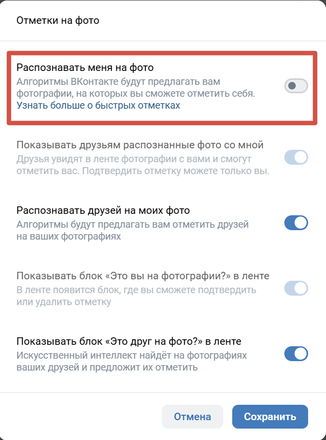 - В разделе «Распознавать фото со мной» можно запретить алгоритмам ВК распознавать вас на снимках. Это исключит риск случайно найти вас по лицу на чужих фотографиях.