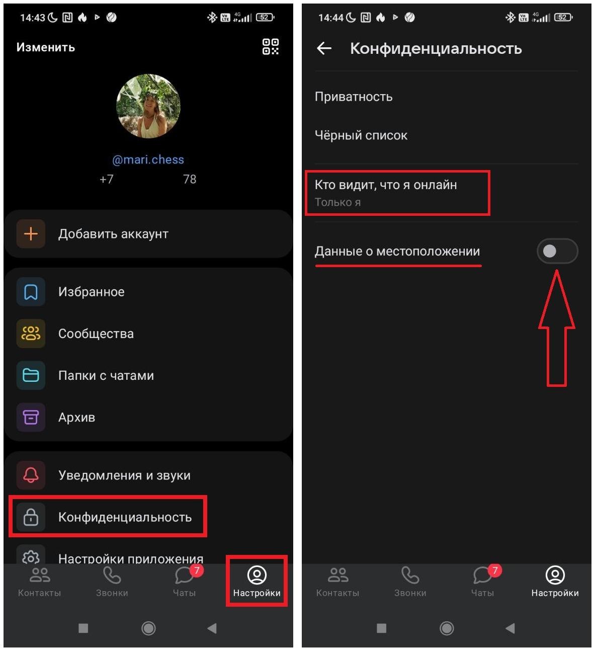 После этого значок онлайн и время последнего посещения не будут отображаться на странице. Вернуть статус можно также через мессенджер.