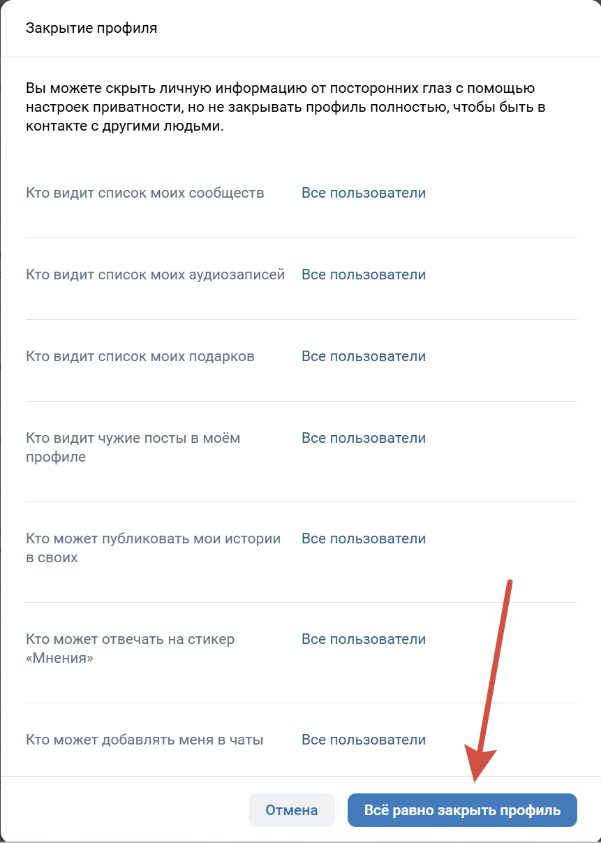 5. Система сообщит, что необязательно закрывать профиль полностью и предложит точечные настройки. Нажимаем «Все равно закрыть профиль».