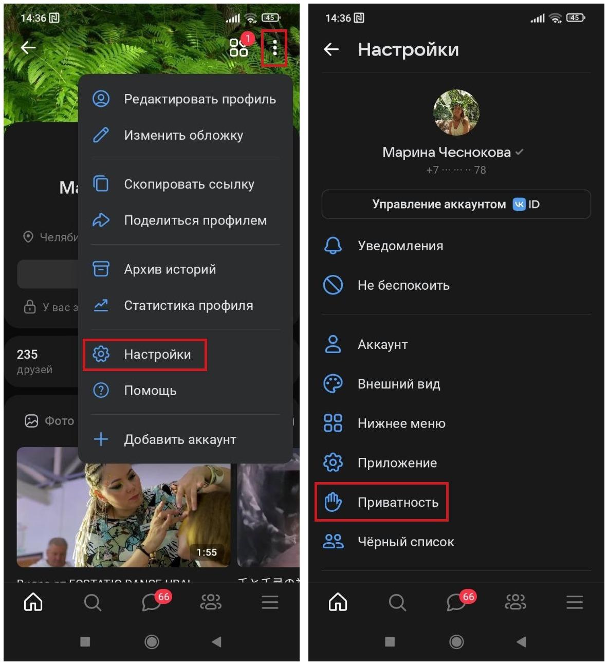 1. Открываем «Настройки» (три точки вверху экрана), переходим в пункт «Приватность».