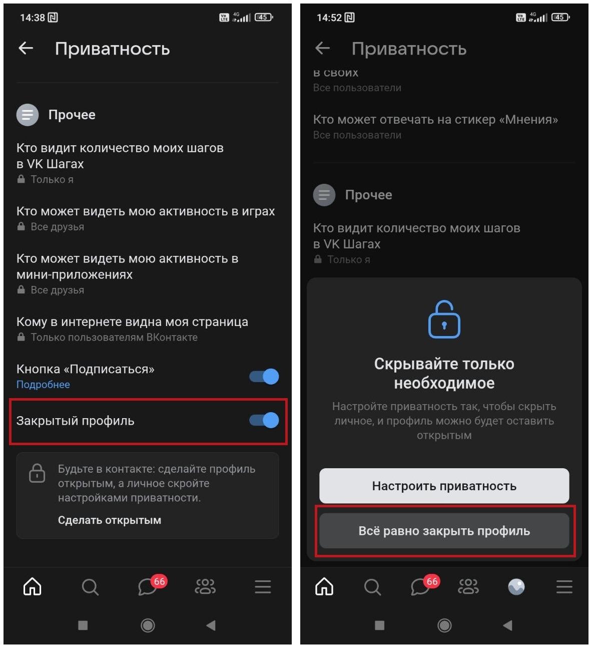 Профиль станет закрытым для посторонних. Настройки приватности изменятся автоматически: ключевые разделы будут доступны только друзьям.