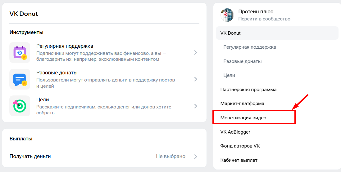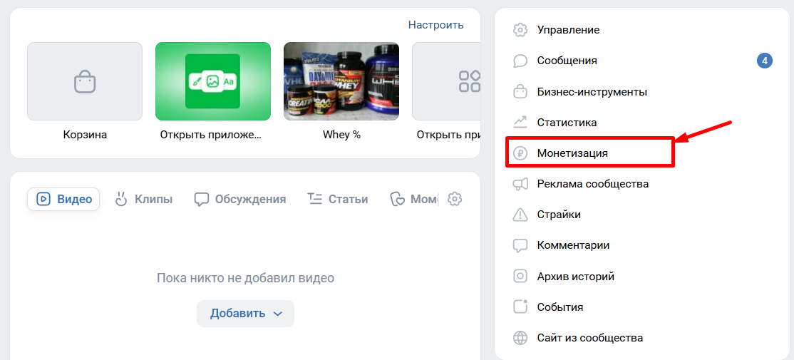 1. Зайти в сообщество с правами администратора. В правом верхнем углу нажать на значок «Монетизация».