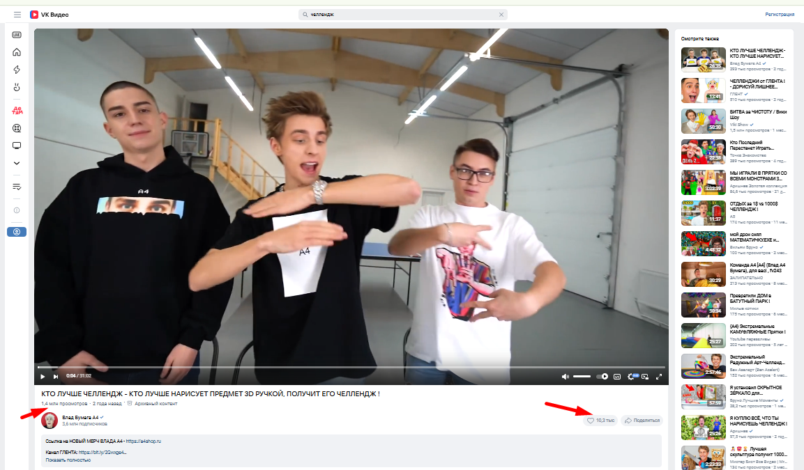 - Использовать тренды. Важно подхватывать актуальные темы, челленджи и популярную музыку, чтобы контент вызывал интерес и чаще попадал в рекомендации. В примере ниже челлендж известного блогера получил 1,4 млн просмотров, более 10 тыс. лайков и множество комментариев.