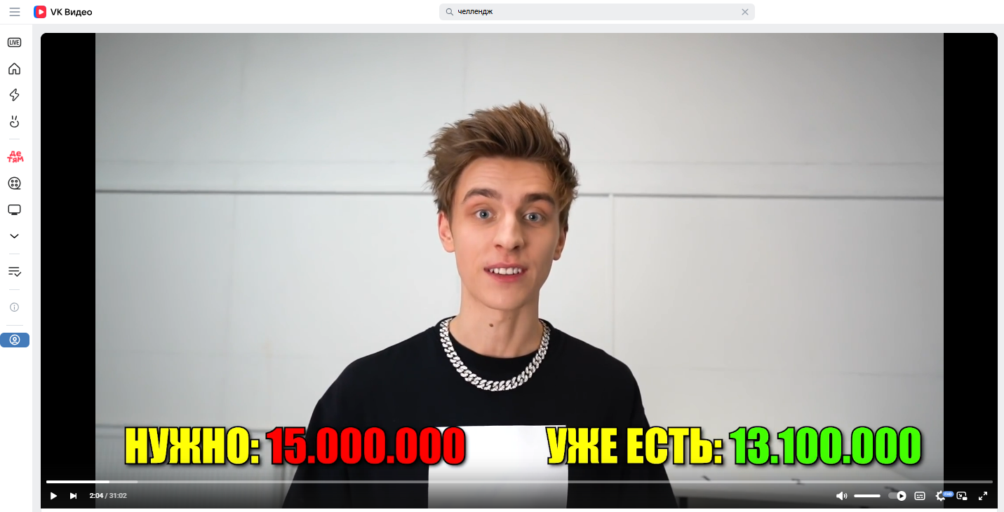 - Вовлекать аудиторию. Например, можно обращаться с просьбой поставить лайк или обещать аудитории выложить продолжение ролика или снять ролик на какую-то волнующую тему, если видео привлечет определенное число подписок, лайков, комментариев и т. д. В примере ниже известный блогер обещает подарить авто одному из подписчиков при условии, что его блог вырастет с 13 до 15 млн.