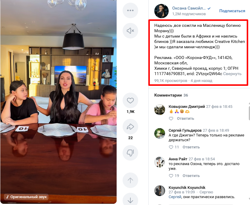Вот пример нативной рекламы, которая размещена в виде развлекательного видео на странице ВК у Оксаны Самойловой. В ролике она с дочерьми оценивает блины одного из известных брендов по шкале от 1 до 10. Инфоповодом была Масленица.