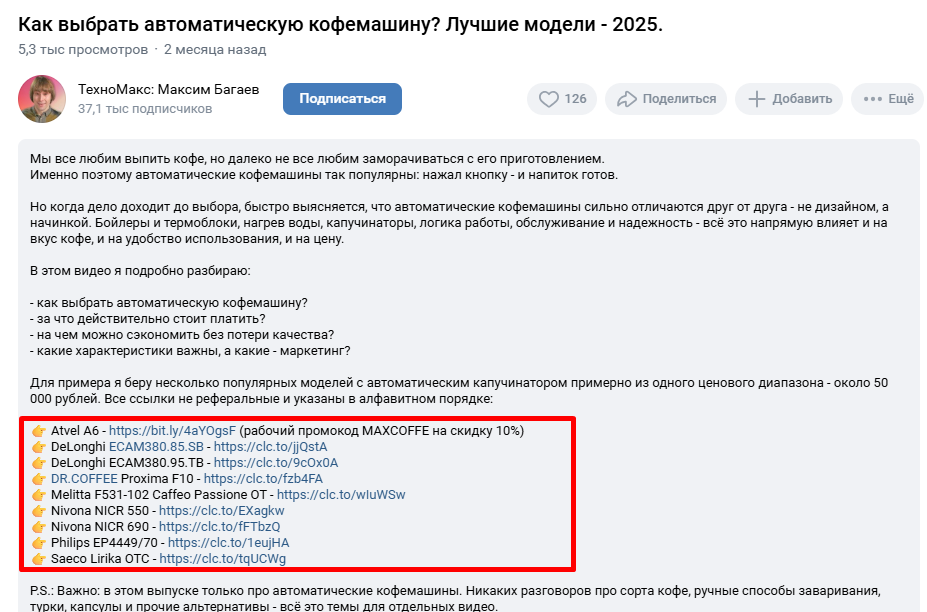 В примере ниже показан обзор 9-ти моделей кофемашин, который выложил один из пользователей в ВК. В видео автор рассказывает о преимуществах каждой модели.