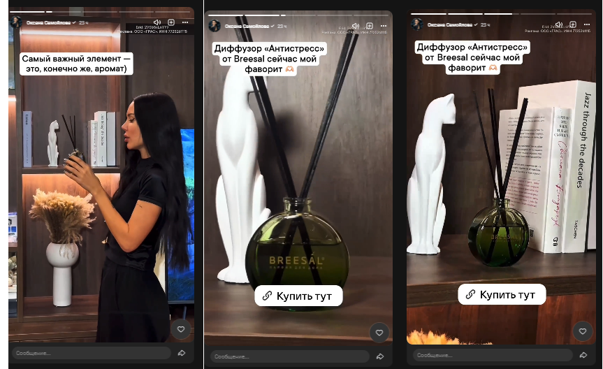 В примере ниже блогер у себя в историях рекламирует ароматический диффузор. Это серия историй (сторителлинг), что позволяет раскрыть все преимущества товара и отношение к нему.