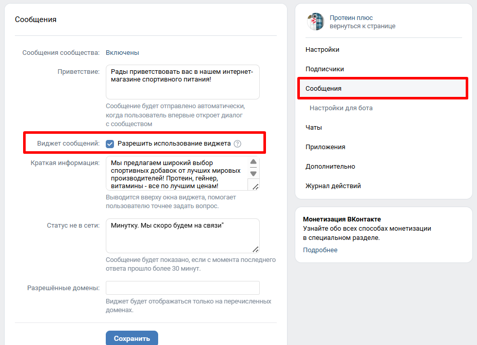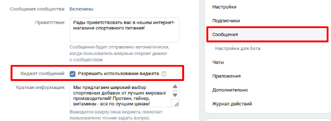 Например, для настройки виджета сообщения, нужно в правом меню выбрать «Управление» → «Сообщения». В настройках разрешить использование виджета.