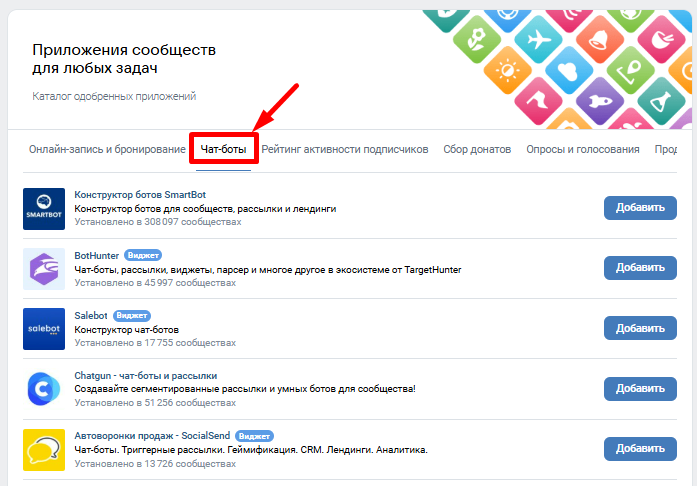 В каталоге виджетов в разделе «Чат-боты» можно найти приложения, которые позволяют самостоятельно конструировать чат-боты под свои задачи.