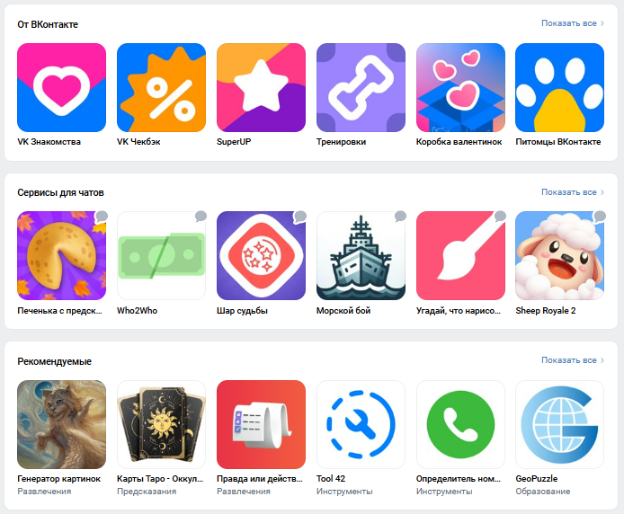 В этом случае откроется страница со всевозможными сервисами ВКонтакте. Большинство из них имеют развлекательный характер и больше подходят обычным пользователям, а не бизнесу.