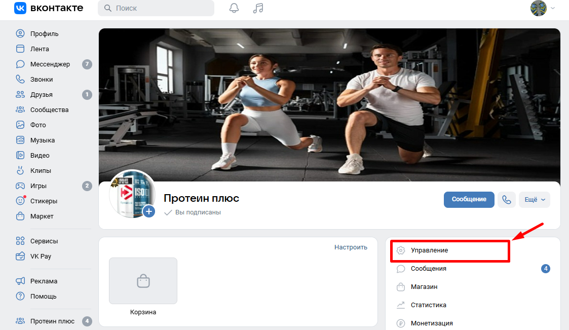 2. В каталоге приложений. Каталог доступен непосредственно в сообществе. Для этого нужно в правом меню под обложкой группы выбрать «Управление».