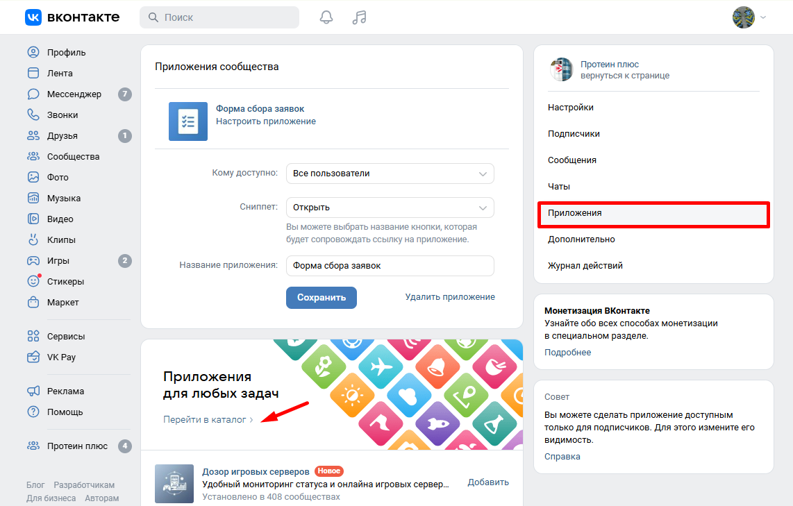 В открывшемся меню выбрать: «Приложения» → «Перейти в каталог». Выше видно, что Вконтакте предлагает настроить форму сбора заявок, поскольку это может повысить продажи.