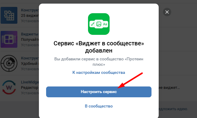 3. Появится сообщение, что виджет добавлен в сообщество. Здесь можно выбрать команду: настроить сервис или перейти к настройкам сообщества.