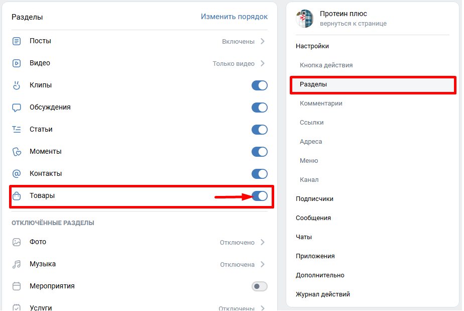 Виджет позволяет сделать витрину товаров прямо в сообществе. Для настройки в правом меню под обложкой перейдите в «Управление» → «Разделы». В открывшемся окне с разделами включите пункт «Товары».