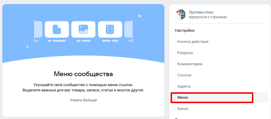 После добавления и настройки виджета меню появится прямо под логотипом сообщества.